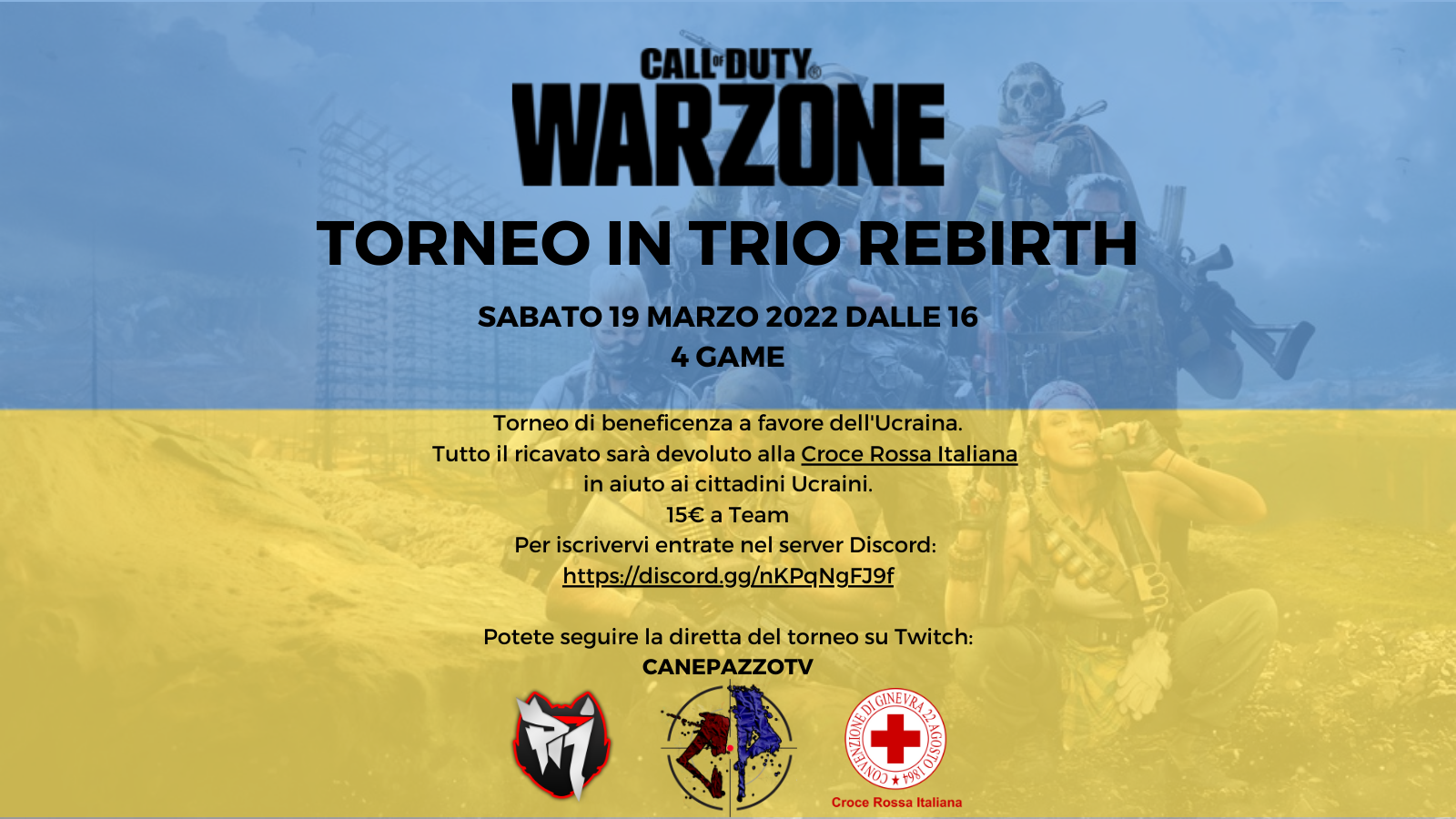 Il giorno 19 Marzo 2022, dalle ore 16:00/16:30, si svolgerà un torneo di Call of Duty Warzone dove chiunque potrà parterciparvi. La modalità di gioco prevista è Rebirth Trio, dove si svolgeranno 4 partite in squadre da tre giocatori; le migliori 3 verranno prese in considerazione. Sarà necessario, per iscriversi, pagare una quota di partecipazione. Per l’appunto, la quota per persona consisterà in 5 (cinque) euro, quindi 15 totali a squadra. La somma verrà interamente devoluta alla Croce Rossa Italiana, che verrà incaricata di impegnarla per l’Ucraina.