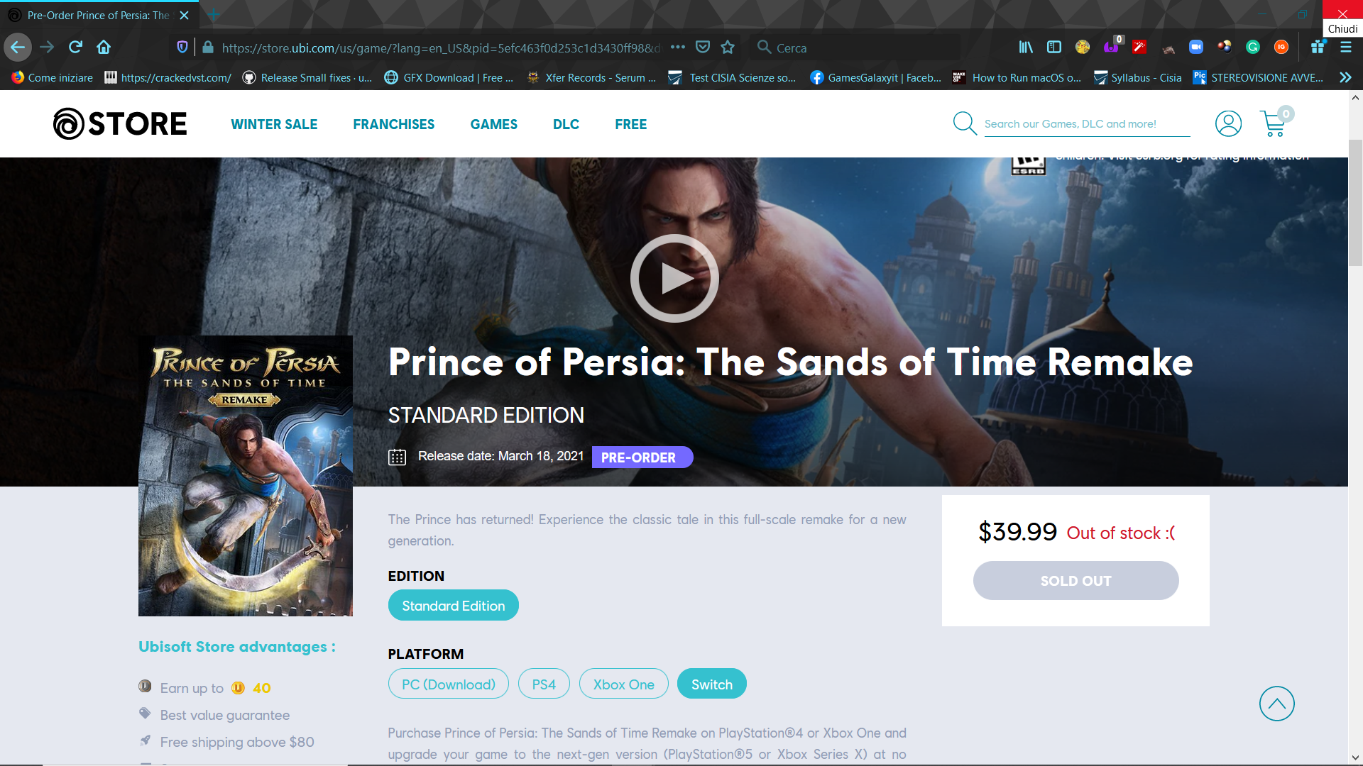 Inizialmente Ubisoft ci presenta il Remake di Prince of Persia come una uscita esclusivamente per le console PlayStation e Xbox e poi per PC attraverso Epic Games Store. Tuttavia è notizia delle ultimissime ore un rumor ben più che fondato sulla uscita anche per Nintendo Switch. In particolare la causa che scatena questa notizia è lo stesso store ufficiale statunitense di Ubisoft. Se infatti date una occhiata al sito potrete anche voi constatare, navigando nella pagina del gioco, che è anche possibile effettuare preorder per Nintendo Switch. Al momento, tuttavia, risulta possibile preordinare il gioco per Xbox, PC e PlayStation: la voce per Nintendo Switch risulta “oscurata”, compare la scritta “Esaurito”.