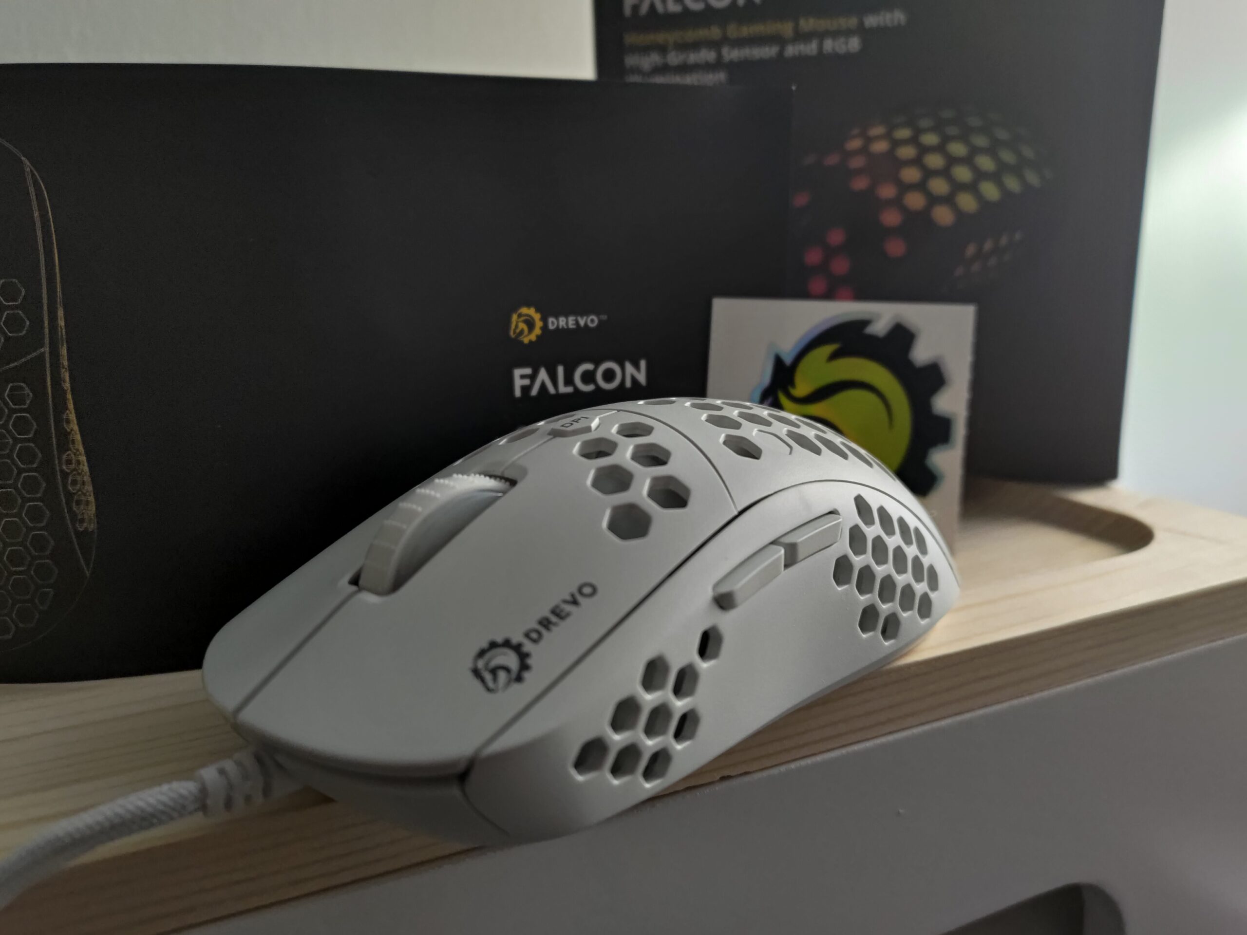 In primis il prodotto presenta un fattore di forma accattivante, con linee moderne e scocca con trame esagonali. Quest’ultime sono forate, tuttavia la componentistica elettrica del prodotto è protetta da un pannello opaco che rende la luce dei led del mouse soffusa. Queste incisioni sullo stampo in plastica opaca rendono ancora di più il mouse leggero. Perchè si, tralasciando una porzione di cavo, il mouse Drevo Falcon pesa solo 70 grammi. Nella scatola del prodotto, oltre al mouse, troviamo un manualetto e un simpatico adesivo che riprende il logo del prodotto.