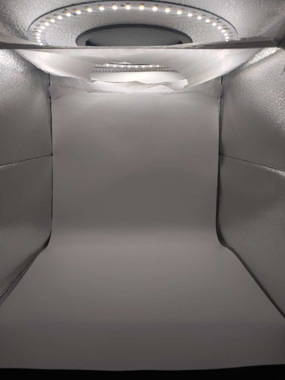 Montare il prodotto è molto semplice e richiede solo due minuti scarsi. Basta “aprire” il box fotografico, spingere sul retro il fondo che tiene il prodotto aperto e in posizione. Se lo si desidera, basta fissare un eventuale sfondo fotografico in PVC (ce ne sono sei disponibili, tra cui Nero, Bianco, Blu, Beige, Grigio e Rosso). Infine, è possibile inserire al di sopra, collegando i supporti in velcro, un diffusore in tela bianco, per la luce.