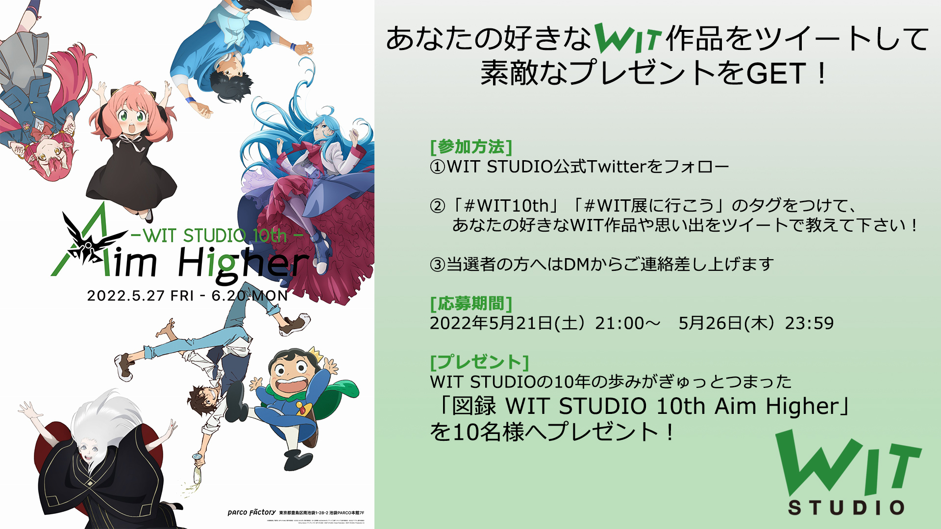 Wit Studio, celebre per aver animato le prime stagioni di Attack on Titan, ha raggiunto i 10 anni di vita. Per questo motivo, a partire dal 27 Maggio si terrà una esibizione presso Ikebukuro’s Parco department store fino al 20 Giugno.